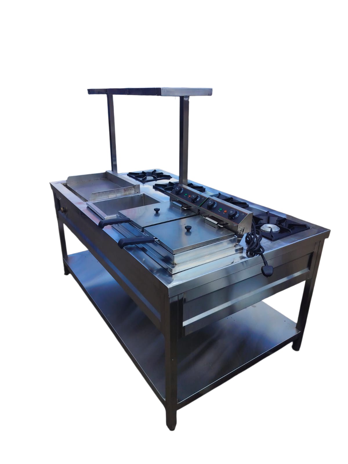 The Combined Cooking Unit is a complete, space-saving solution designed for high-performance commercial kitchens. It integrates multiple cooking functions into one compact system, including a hotplate, chips dumper, four gas burners, and an imported double deep fryer.